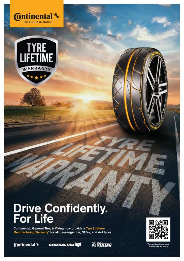 Continental Tyre Malaysia (CTM) mengumumkan jaminan pengeluaran sepanjang hayat bagi tayar baru keluarannya adalah sah bagi semua kenderaan penumpang, SUV dan 4×4 — termasuk tayar keluarannya yang menggunakan jenama General Tire dan Viking.