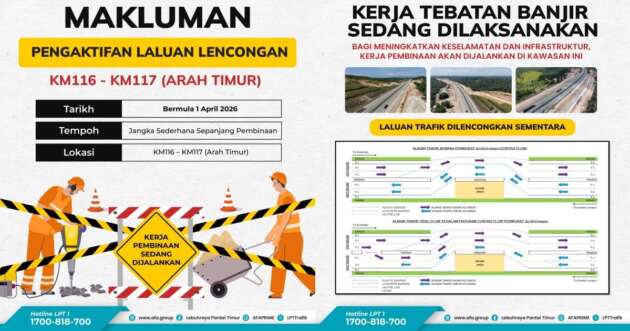 The post Kerja tebatan banjir di LPT1 akan dilaksanakan mulai 1 April 2026, melibatkan KM116-KM117 arah timur appeared first on Paul Tan’s Automotive News.
