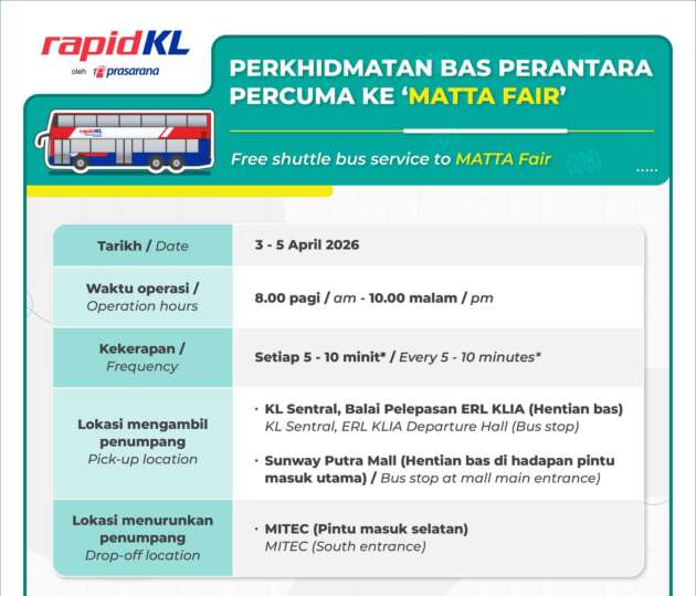 The post MATTA Fair 2026, 3-5 April di MITEC – bas perantara Rapid KL percuma dari KL Sentral, Sunway Putra Mall appeared first on Paul Tan’s Automotive News.