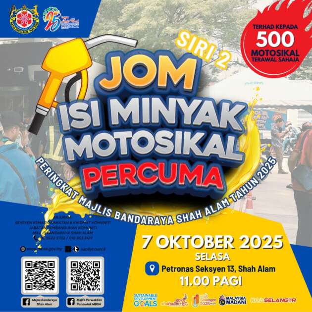 Berita baik untuk penunggang motosikal di sekitar Shah Alam. Pada 7 Okt 2025 (esok), Majlis Bandaraya Shah Alam (MBSA) bakal menganjurkan program Jom Isi Minyak Motosikal Percuma. Ia akan berlangsung di Stesen Minyak Petronas Seksyen 13 mulai jam 11 pagi. Menurut MBSA, walau bagaimana pun, tawaran ini terhad untuk 500 buah motosikal terawal sahaja.