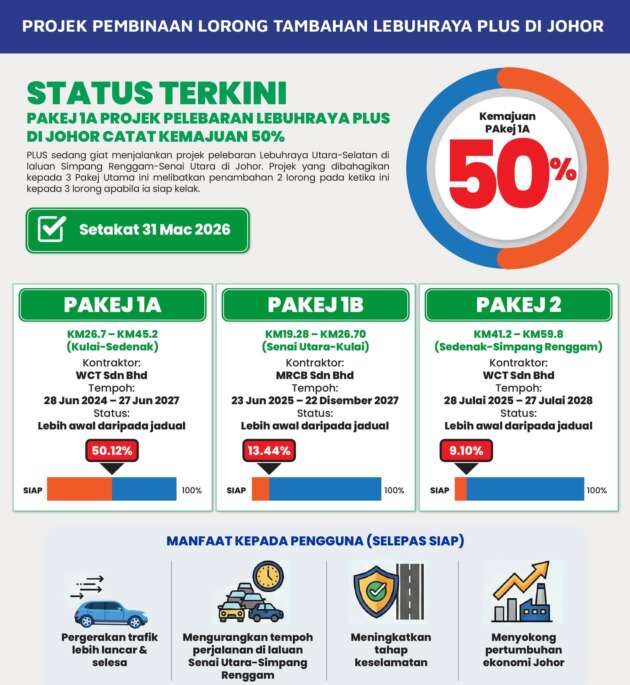 The post Projek pelebaran Lebuhraya PLUS di Johor melibatkan Pakej 1A capai kemajuan 50.12% setakat 31 Mac 2026 appeared first on Paul Tan’s Automotive News.