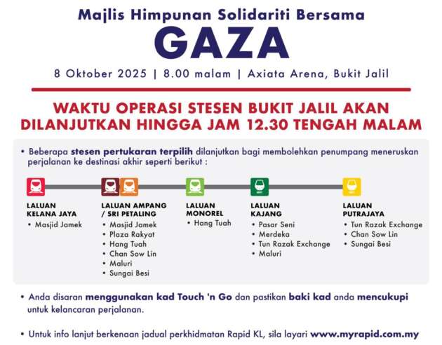 The post Stesen LRT Bukit Jalil dilanjut operasi hingga 12.30 tengah malam ini sempena Solidariti Bersama Gaza appeared first on Paul Tan’s Automotive News.