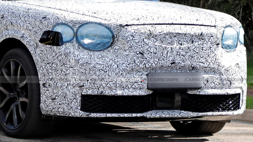 As we can see from these pics of the prototype, it’ll look very different from the Cayenne EV. It has a squared nose, flat hood, and flared rear fenders, much like other Bentleys, but it might be best not to put too much store into the quad headlight setup and oval-shaped taillights.